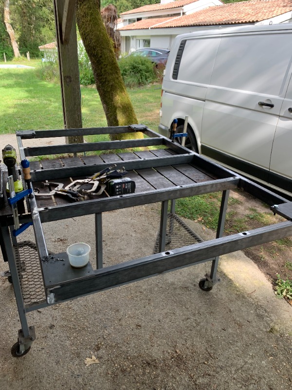 - J'ai également modifié mon chassis pour cet arrosage. Le fond en bois a été viré et fermé en tôle inclinées avec une grille de retenue. Dessous un bac où sera stocké l'huile soluble et sa pompe. Cet arrosage n'est pas encore installé donc on verra lors de la première installation s'il y a nécessité à modifier en fonction si j'en fous partout...