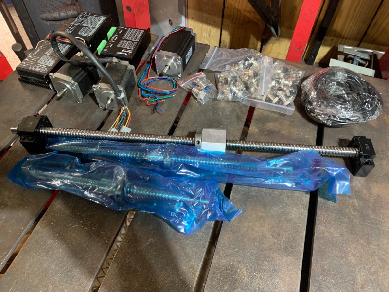 Une partie du matos que j'ai rassemblé au fur et à mesure. Steppermotors, leur drivers, les vis à billes, un peu de consommables de branchement câbles etc...