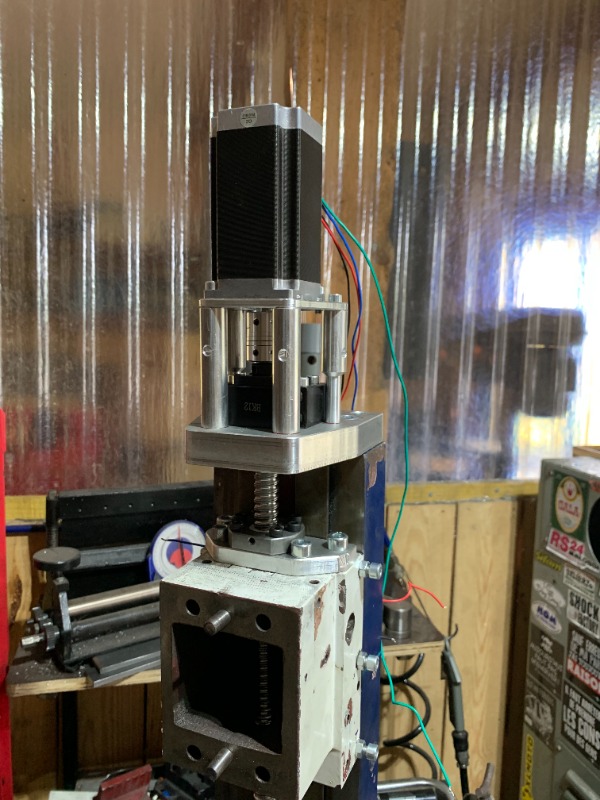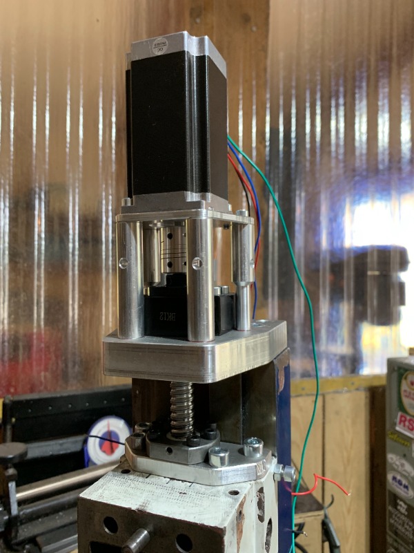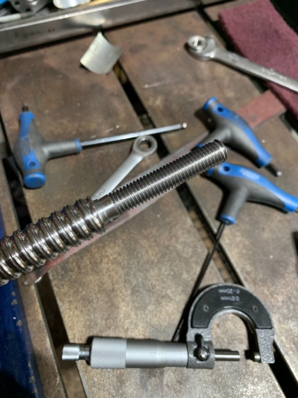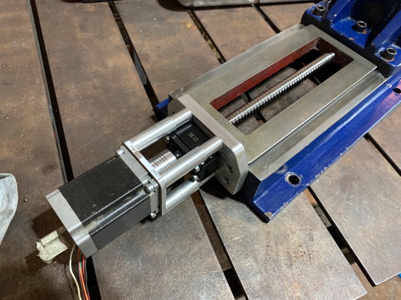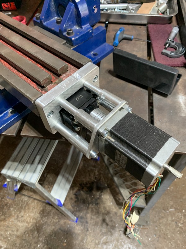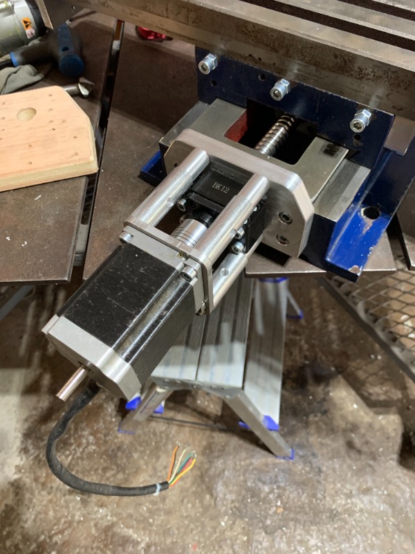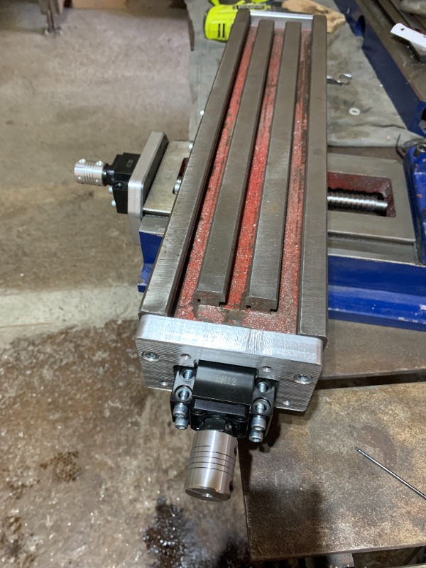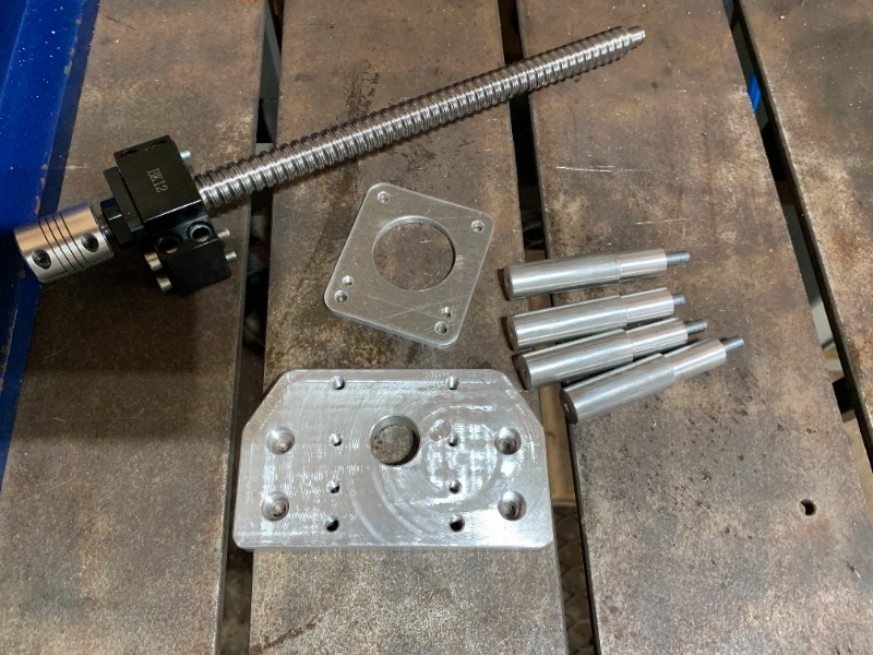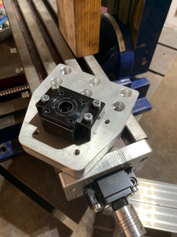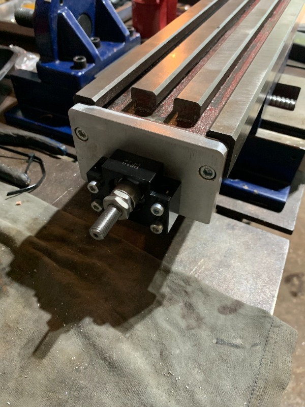 Sur cet axe l'écrou est "fixe" et c'est la vis qui entraîne la table, du coup fixation de la vis à gauche et à droite fixation qui supportera le moteur. La vis à bille étant trop longue mais je ne voulais pas la couper pour le moment. Usinage au tour pour le diamètre qui passe dans le roulement de maintien côté gauche et filetage pour la tension et fixation.
