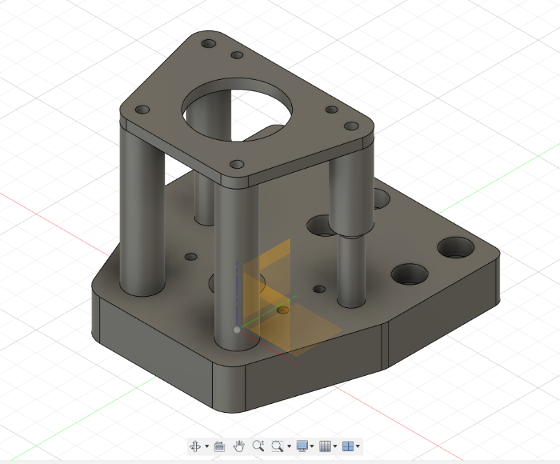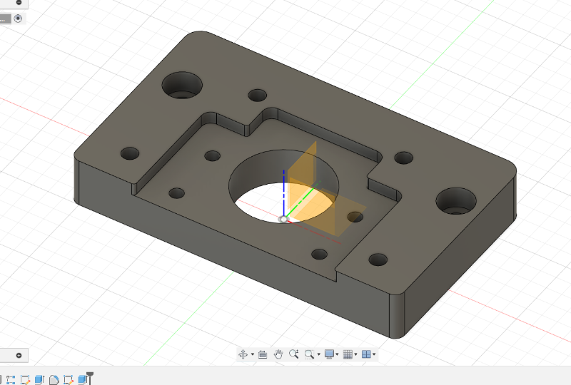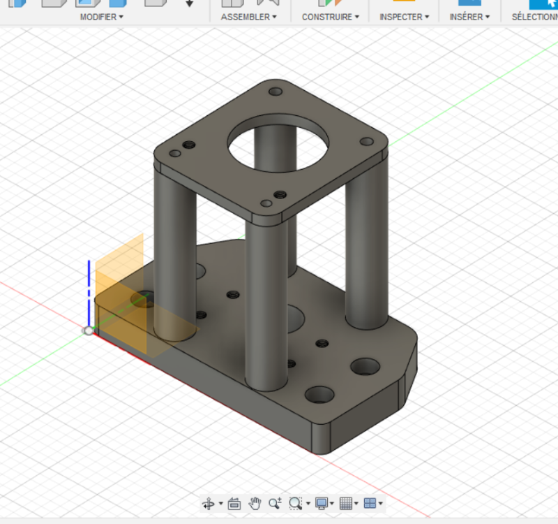 - Modélisation dans un premier temps et prise de côtes sur la meule. Le support sera en 3 parties vissées pour faciliter l'usinage. Beaucoup de taf pour rien et de temps passé pour la faire en une seule pièce avec de multiples reprises en changeant sa position dans la fraiseuse. On va faire simple et rapide. Les 3 pièces sont usinées en même temps dans une plaque d'alu de 10mm.