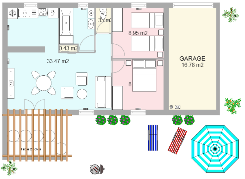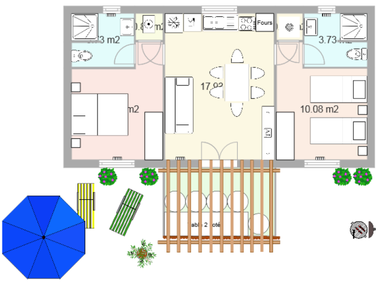 - Les logements sont tous du même format. Des maisons de 55m² avec 2 chambres, 1ch 1 lit double / 1ch 2 lits simples. 1pièce principale avec cuisine et canapé lit. SDB WC/Douche.